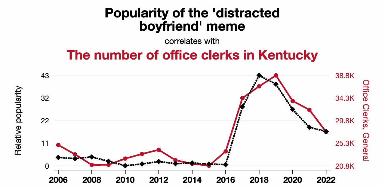 Right, now youāve got your data goggles on, check out Tyler Vigenās brilliant collection of line graphs showing close but (probably) completely meaningless correlations like this:
